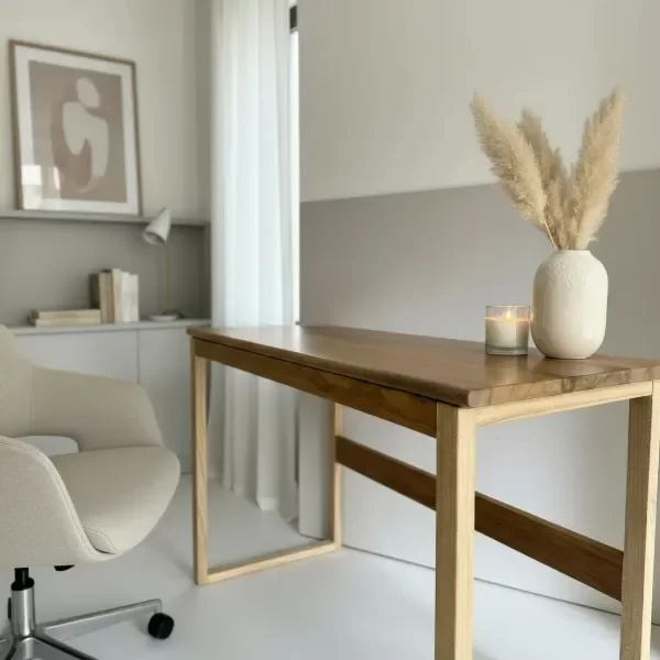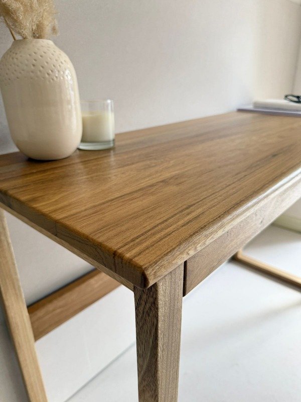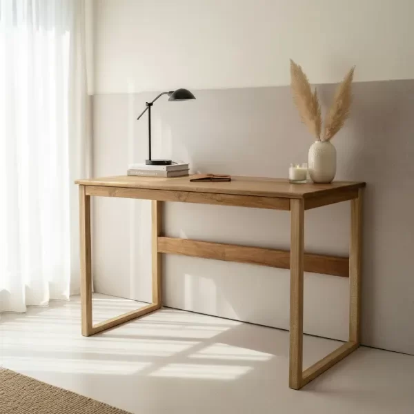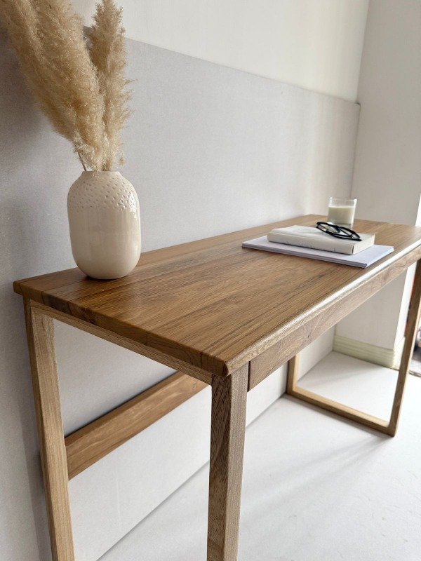 Seleccionado por su veta marcada y su tono natural cálido. Su diseño liviano y minimalista permite integrarlo en espacios pequeños, ya sea como escritorio de trabajo, mesa auxiliar o Dressoire.